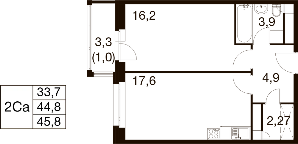 1-комнатная  45.8 м2